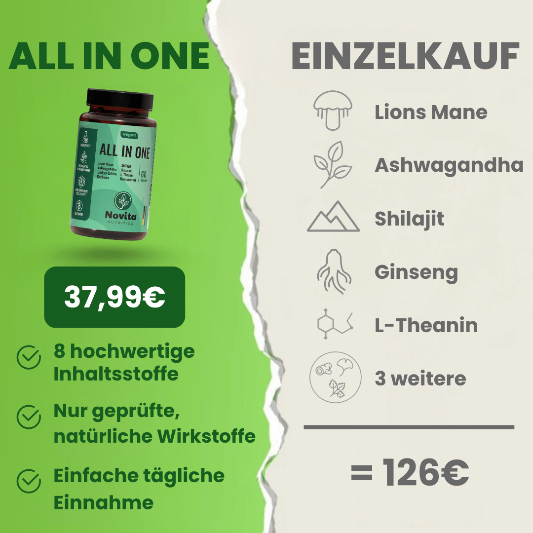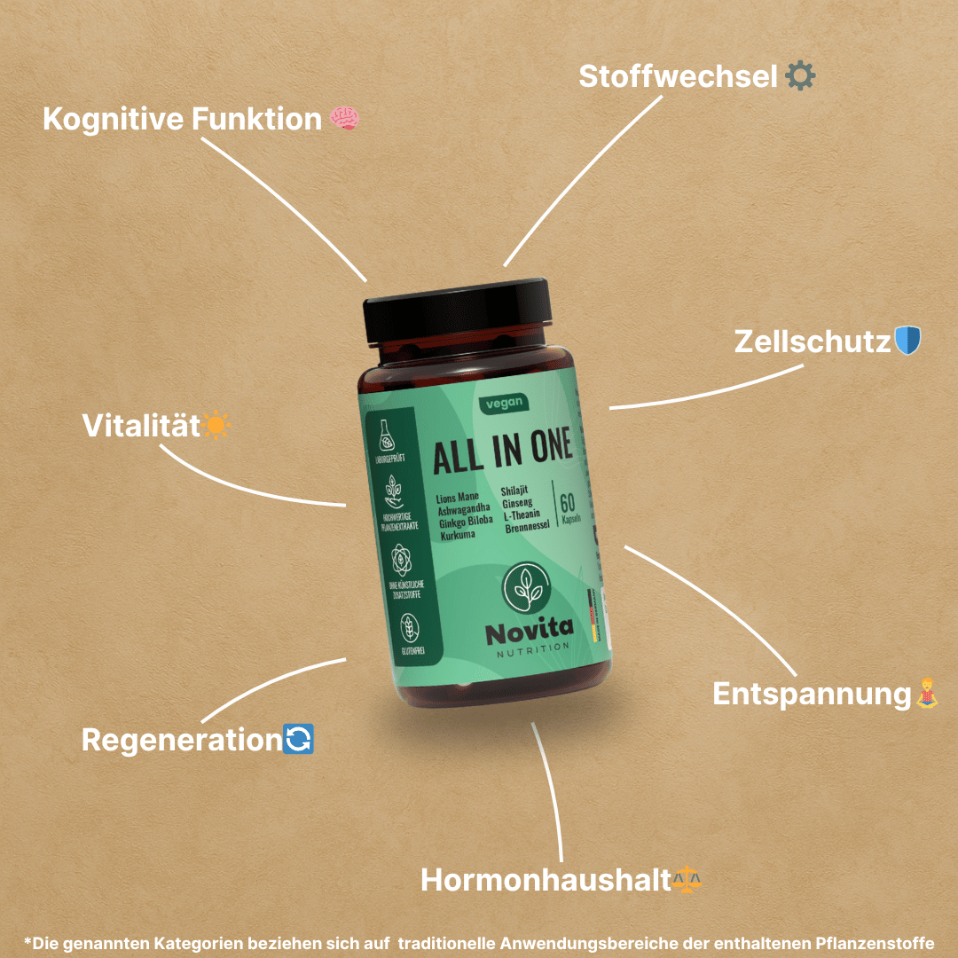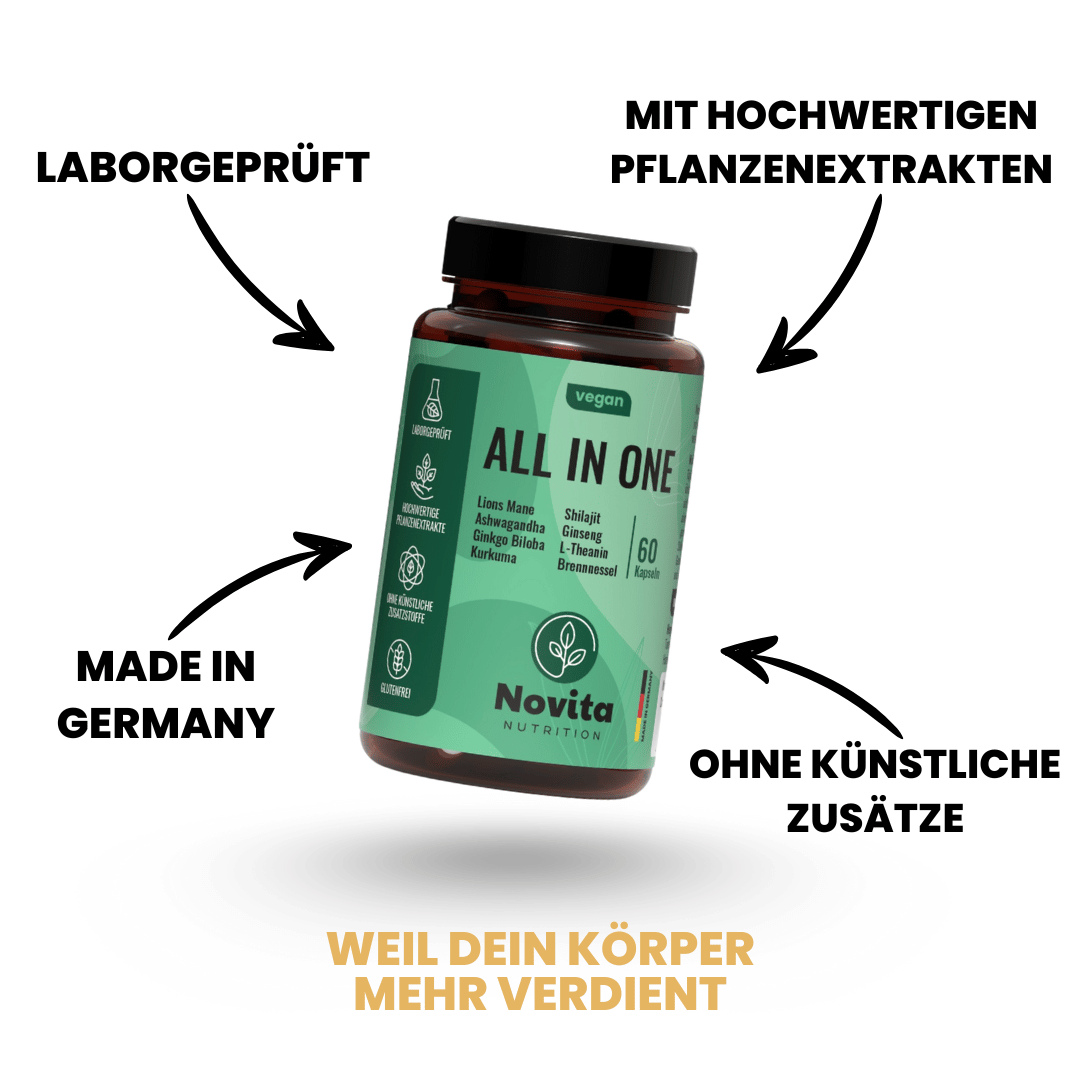 Novita All in One vereint bewährte Pflanzen- und Vitalstoffe wie Ashwagandha, Lions Mane, Shilajit und Ginseng in einer intelligent abgestimmten Tagesdosis. Entwickelt für Menschen, die ihren Körper natürlich unterstützen möchten und auf Qualität setzen – ohne Kompromisse.